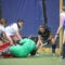Dans l’article sur les balles hautes dans le cercle, il y a un élément qui n’est pas mentionné car peu connu (en tout cas, visiblement, du gardien du Braxgata). Le positionnement des joueurs ne pose pas de problème et Van Aubel est bien isolé au tombé de la balle par rapport aux JOUEURS du Braxgata. Toutefois, la balle tombe dans une zone inférieure à 5 mètres autour du but. Or, si le gardien intervient, même s’il est deuxième sous la balle, il aura la faute en sa faveur et donc remise en jeu aux 16 mètres.