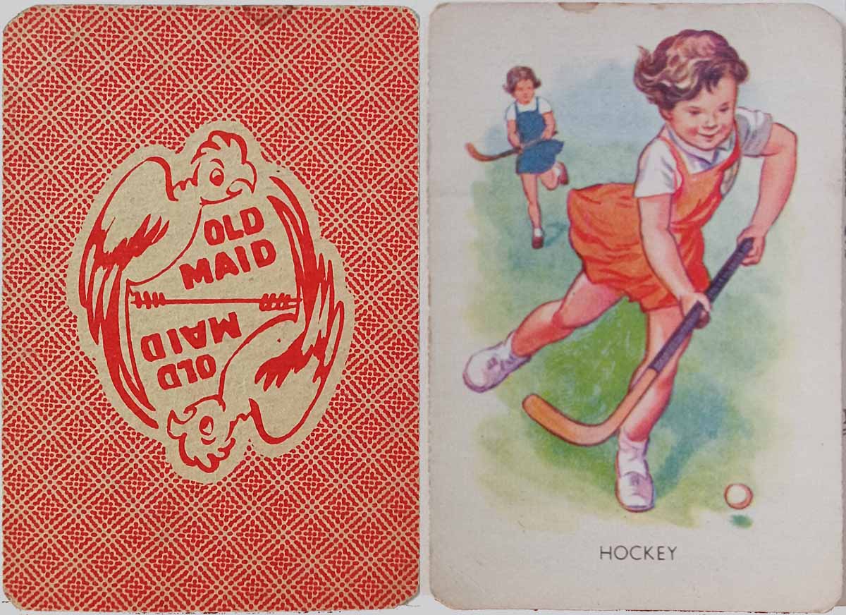Trouvé : une carte à jouer venant d’un jeu de cartes dénommé « Old Maid » de la série sport d’enfants datant des années 50 et venant d’Angleterre. Avec un stick probablement du style Hammer. A ne pas confondre avec cette carte-ci…