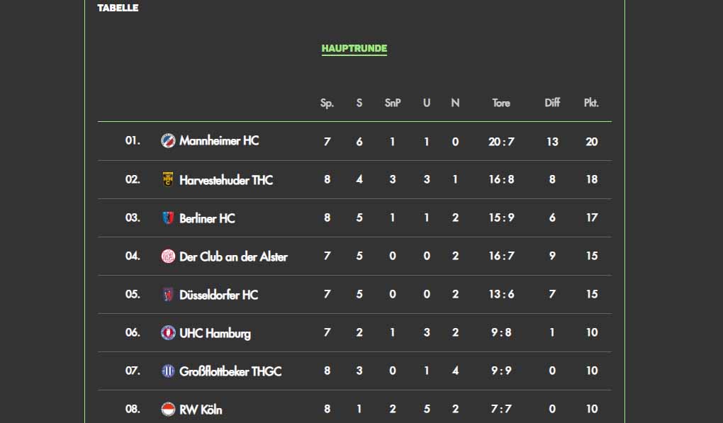 Une belge a trouvé un job de T1 à l’étranger. Il s’agit de Sofie Gierts qui est devenue la coach de l’équipe Dames de Mannheimer. Nous nous sommes évidemment intéressés à la progression de cette équipe qui se trouve en tête du championnat devant Harvestehuder et le Berliner. On en est à la 8e journée de compétition pour la moitié des équipes, la 7e pour l’autre moitié, dont Mannheimer.